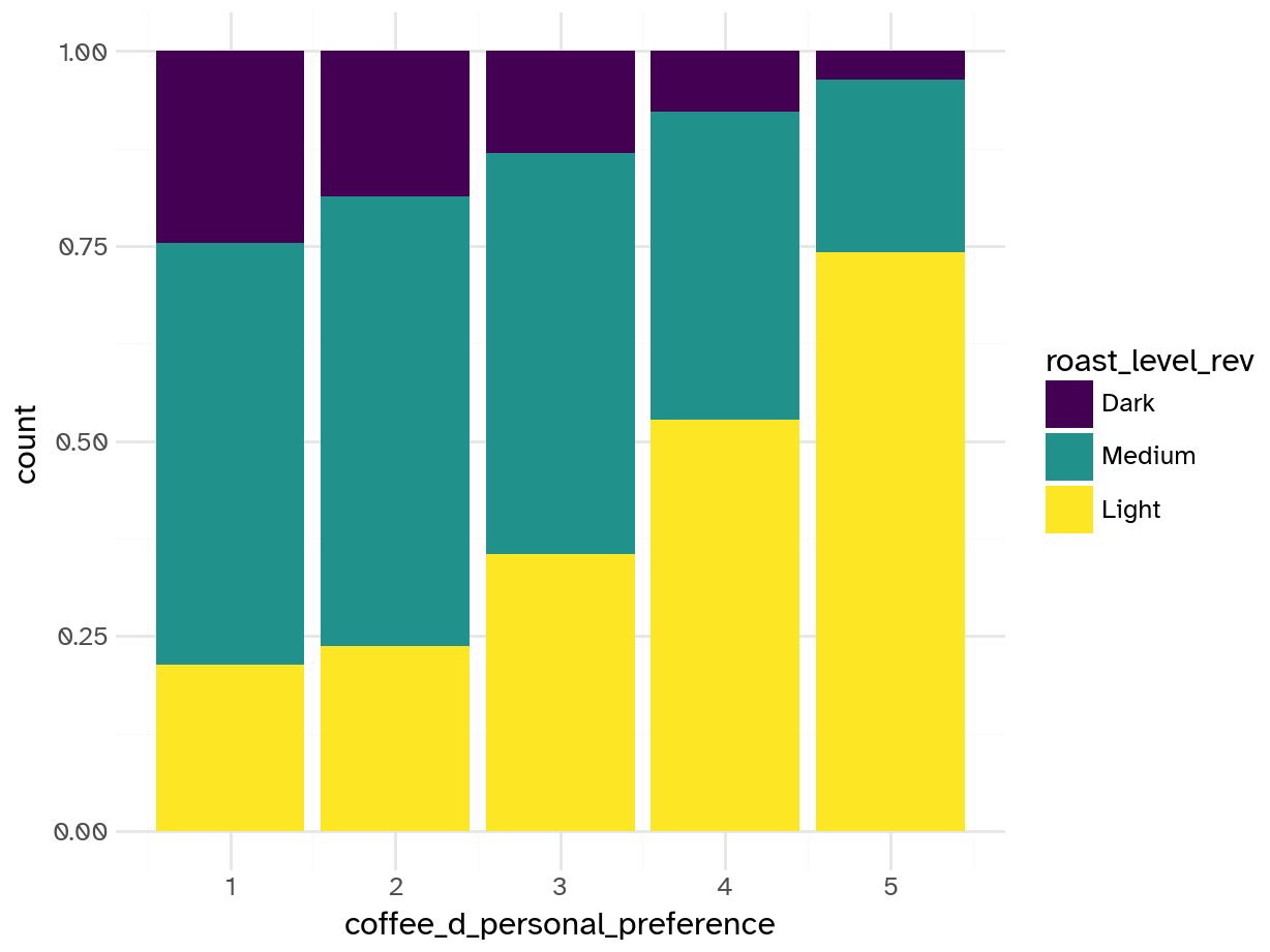 Our ultimate goal on a future assignment is to predict whether or not individuals like coffee D based on their survey responses and taste tests for coffees A-C.1 We will use a binary form of coffee_d_personal_preference variable as our target.