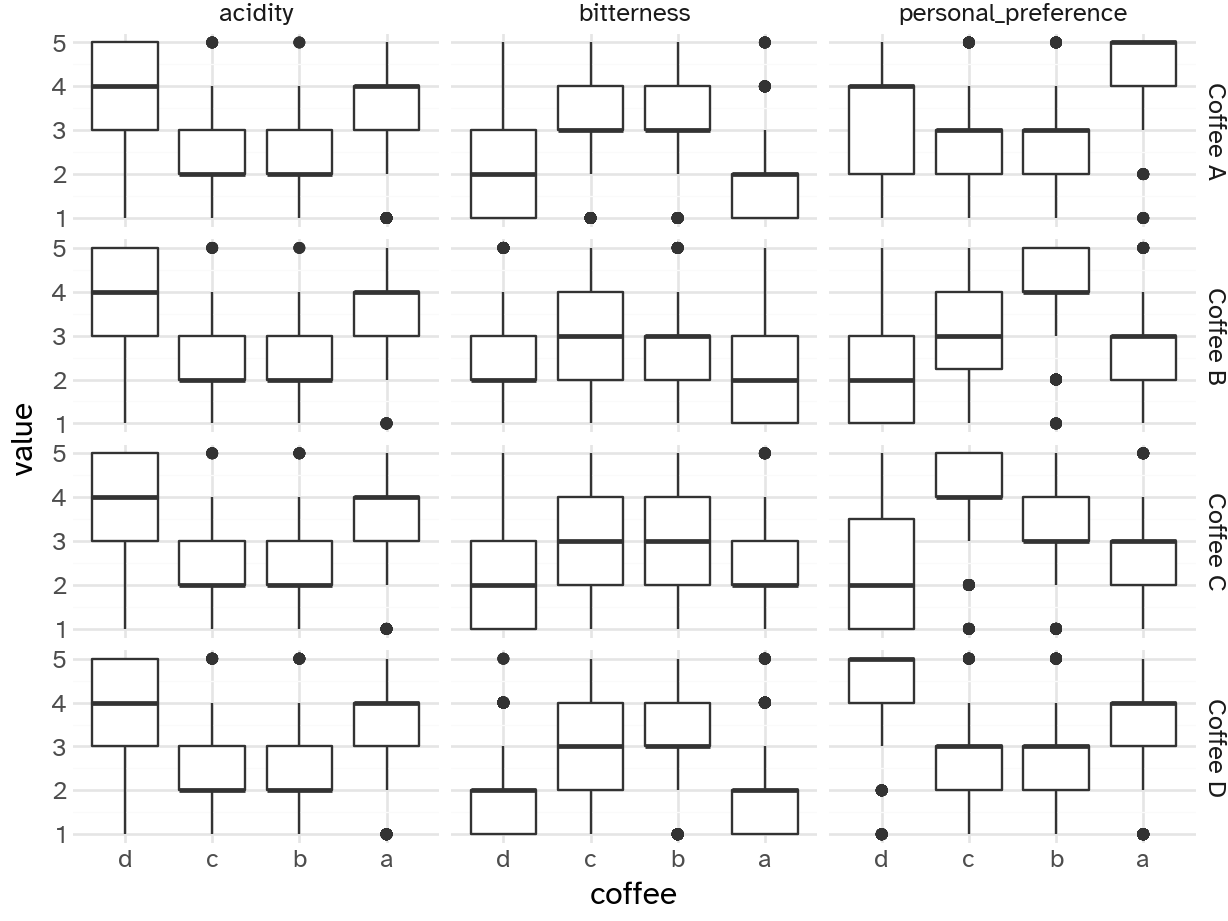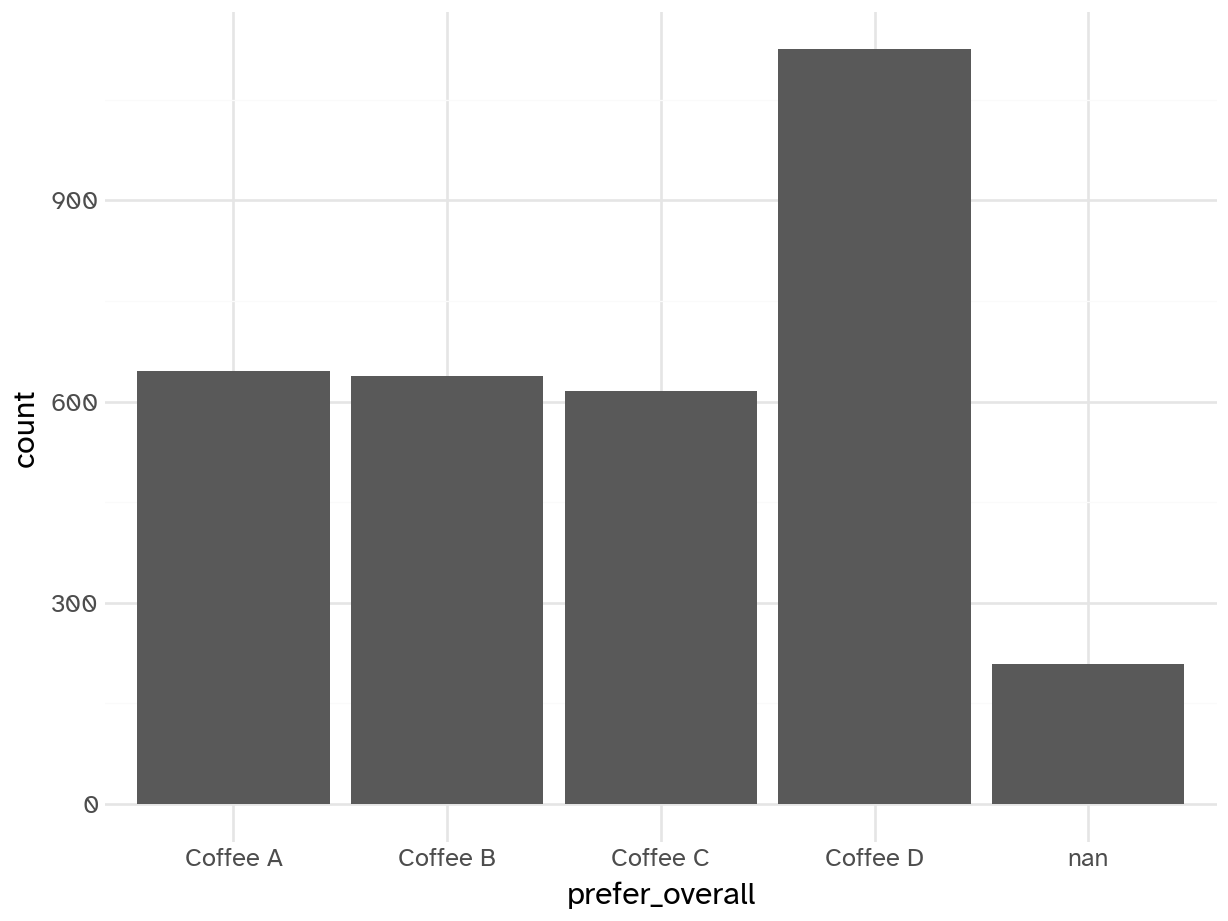 | prefer_abc | character | Between Coffee A, Coffee B, and Coffee C which did you prefer? |