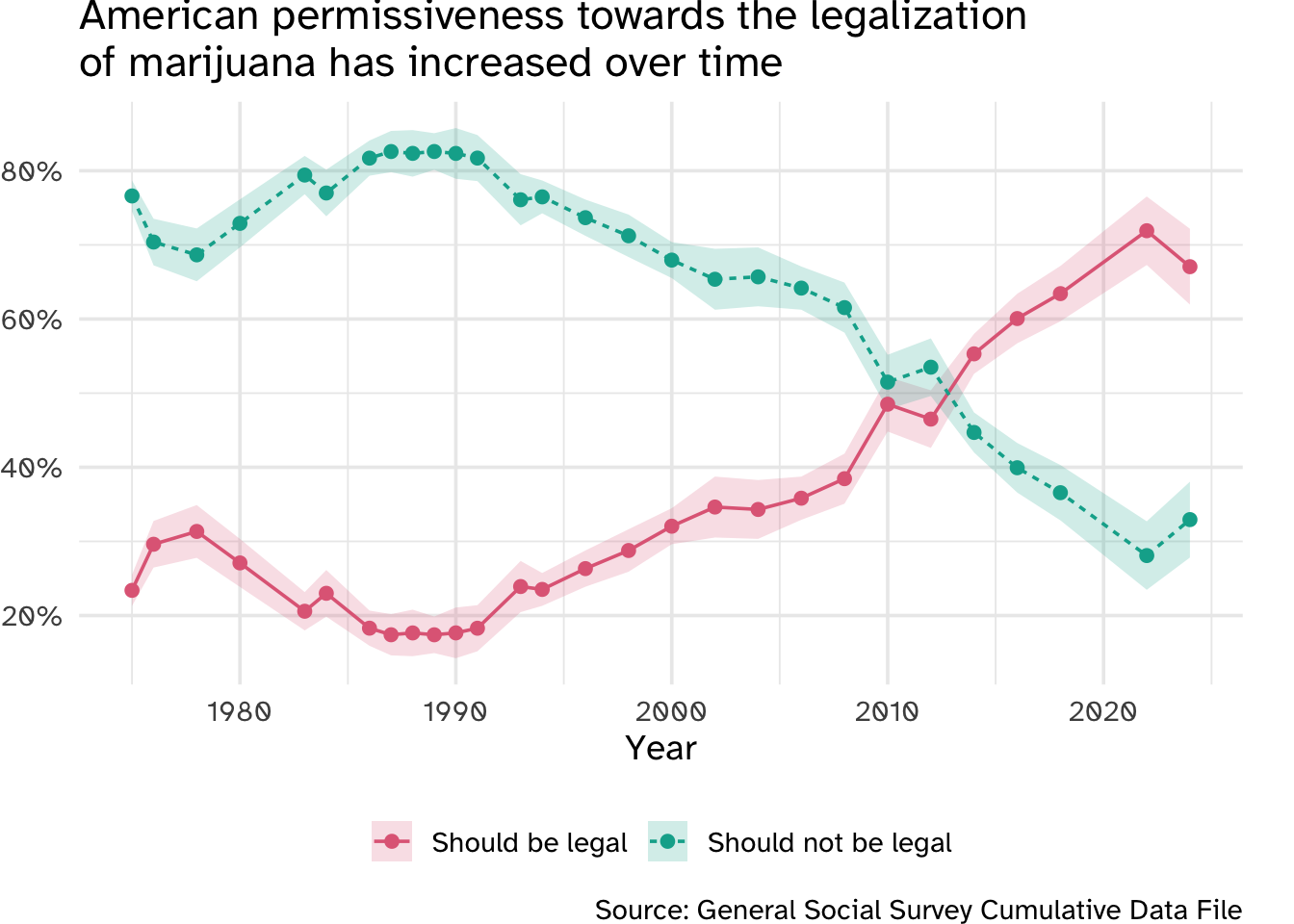 Over the past 35 years, American attitudes towards marijuana have softened extensively. In the early 2010s, the number of Americans who believed marijuana should be legal began to outnumber those who thought it should not be legal.