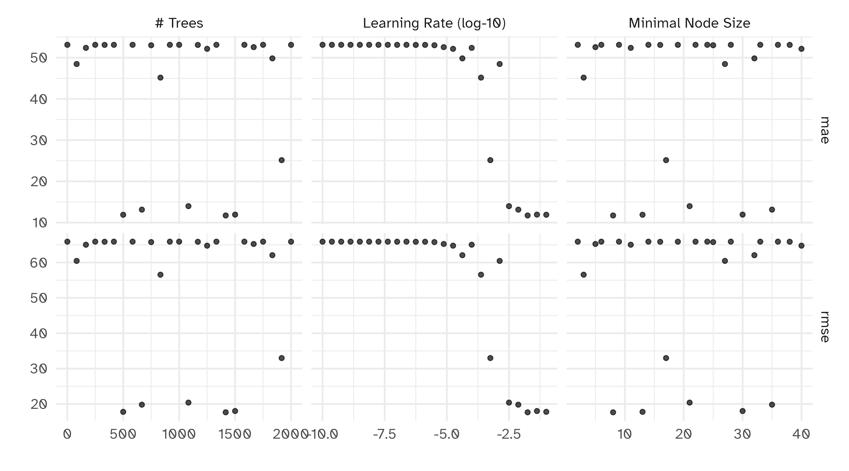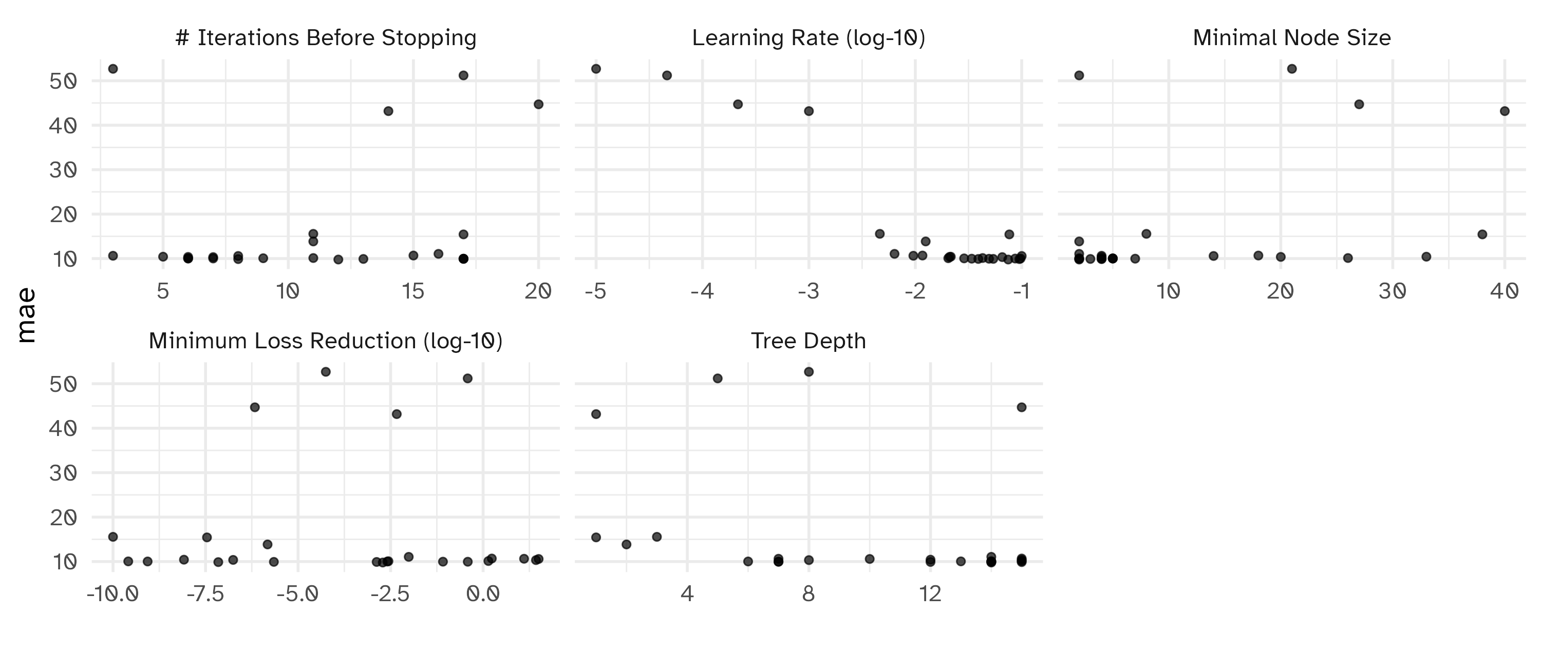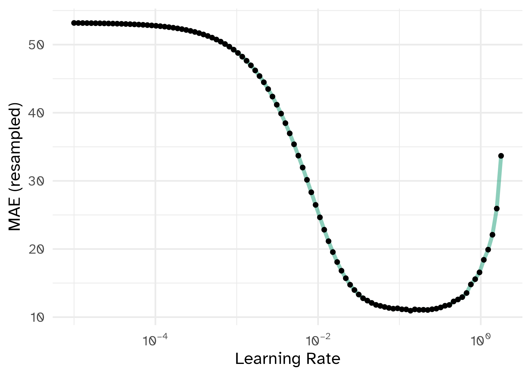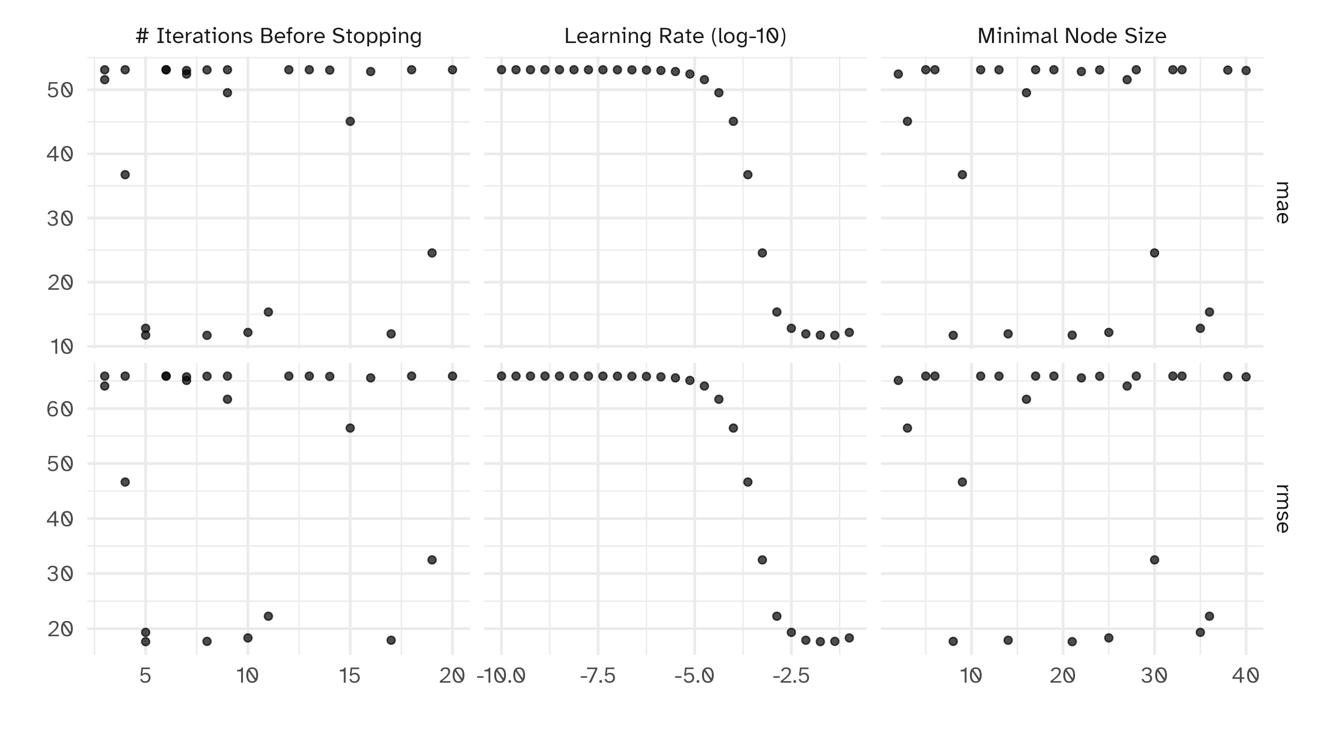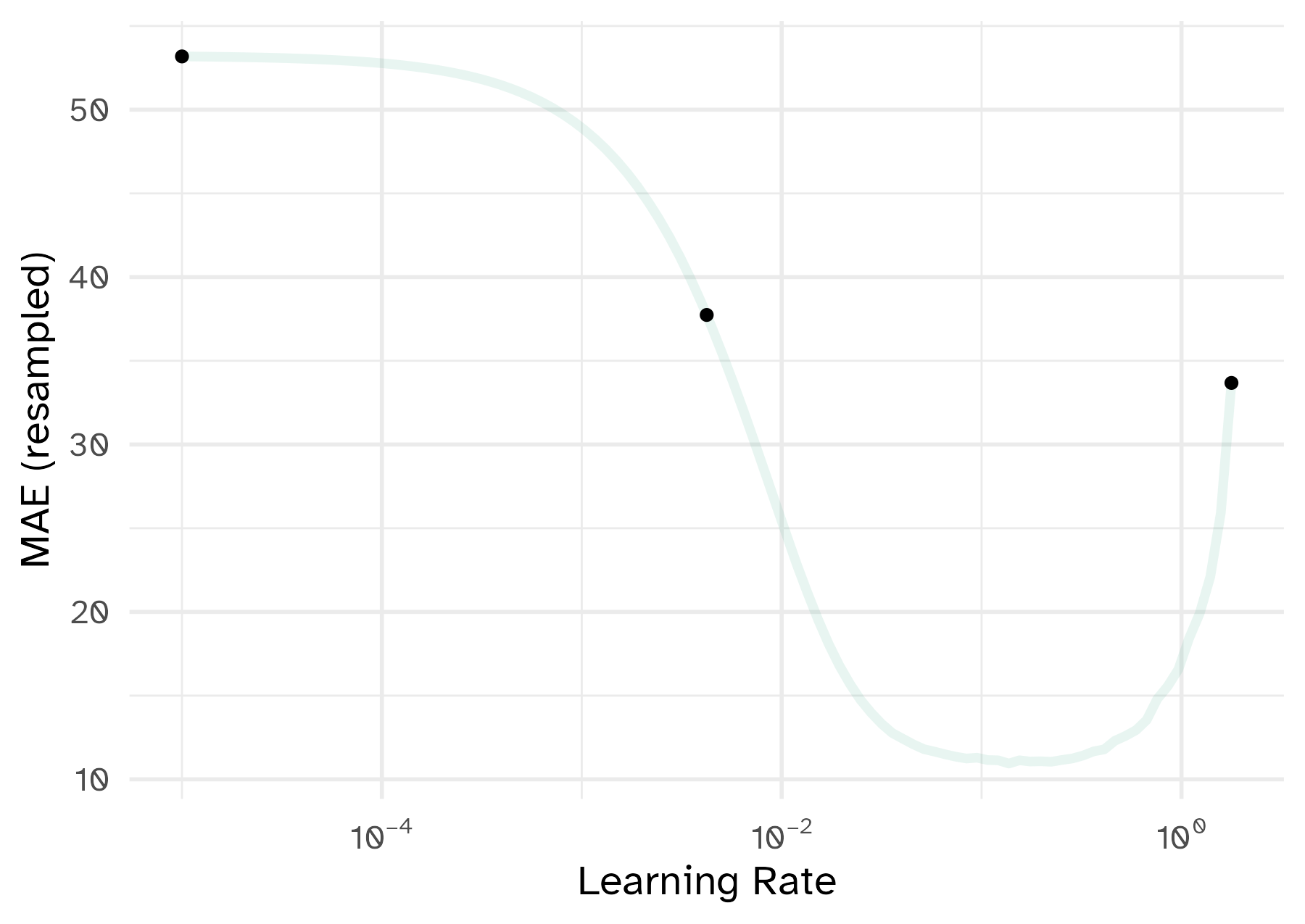 mtry: The number of predictors randomly sampled at each split (in \([1, \text{ncol}(x)]\) or \((0, 1]\)).min_n: The number of samples needed to further split (\([1, n]\)).learn_rate: The rate that each tree adapts from previous iterations (\((0, \infty]\), usual maximum is 0.1).trees: The number of trees (\([1, \infty]\), but usually up to thousands)stop_iter: The number of iterations of boosting where no improvement was shown before stopping (\([1, trees]\))min_nmin_n| tuning parameter | overfit? |