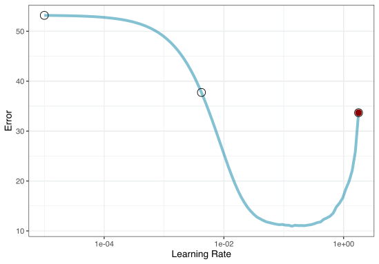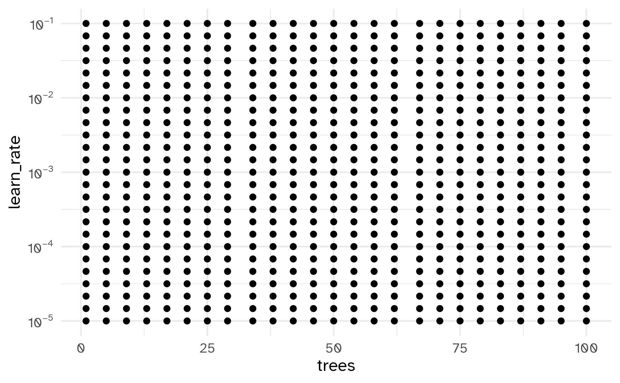 To demonstrate simple concepts, weβll look at optimizing the number of trees in the ensemble (between 1 and 100) and the learning rate (\(10^{-5}\) to \(10^{-1}\)).
